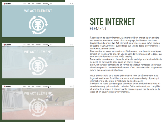 La marque Element souhaite créer un événement et élargir son panel de client web via une animation commerciale, ponctuelle itinérante connectée. Nous avons mis en place des actions et méthodes pour atteindre nos objectifs. Une animation itinérante durant 8 semaines dans des métropoles pour conquérir un maximum de clients durant notre tournée. L’animation physique itinérante sera présentée dans un container maritime dry de type 40 pieds. De plus, un mini site événementiel sera créé pour notre promotion et sera épaulé par une application mobile.